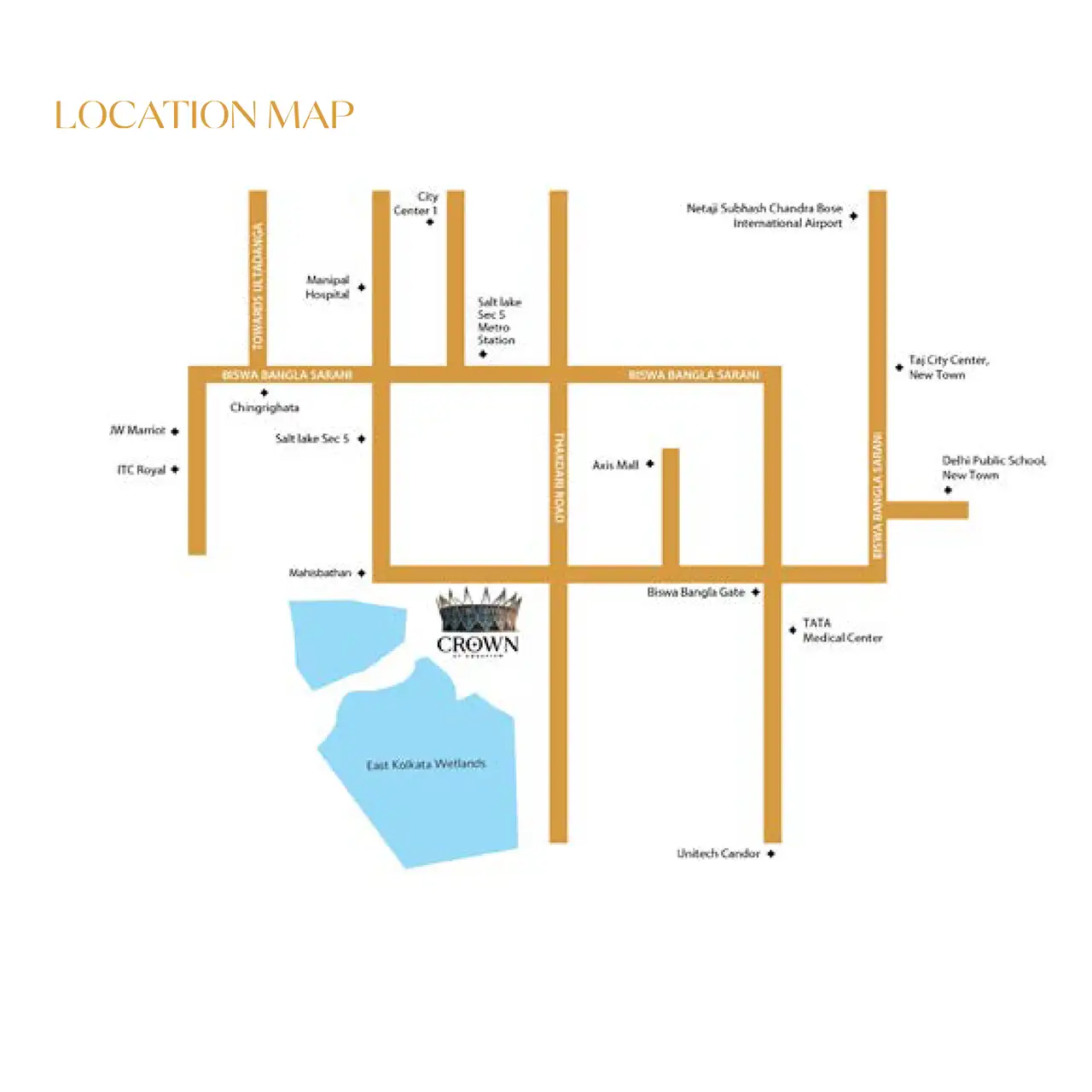 Crown At Aquaview is perfectly located in Sector V, Mahisbathan, Salt Lake — just 5 minutes from the metro, surrounded by lush wetlands, top business hubs, schools, and hospitals. Enjoy seamless connectivity with a serene, luxurious lifestyle.